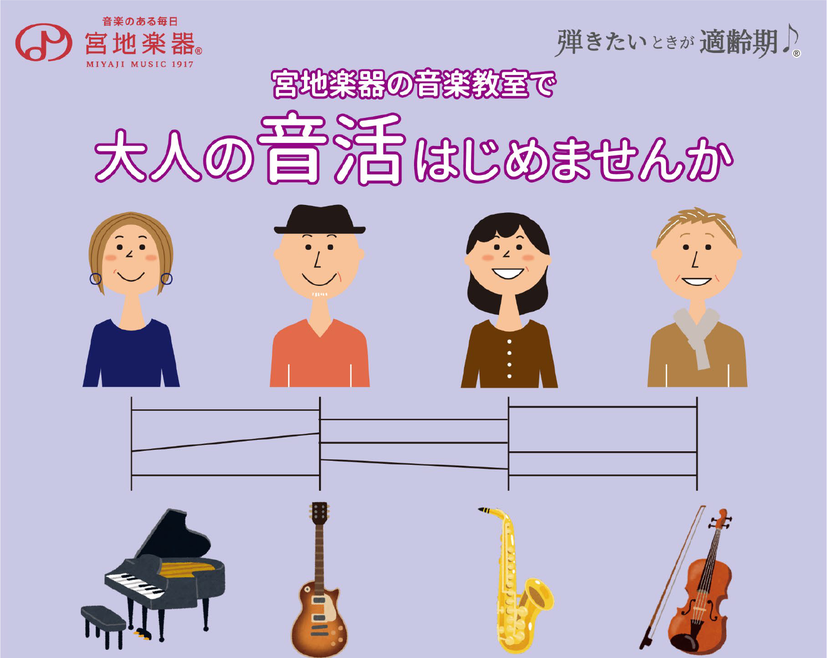 60歳以上の方限定キャンペーン 期間中、宮地楽器の各教室ではワンコイン500円でお好きな3コースまで体験できます 【お申込み期間】 10/1(水)~10/31(金) 【実施期間】 10/1(水)~11/30(日)