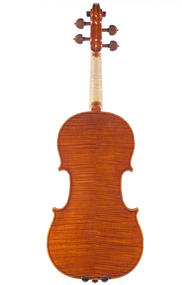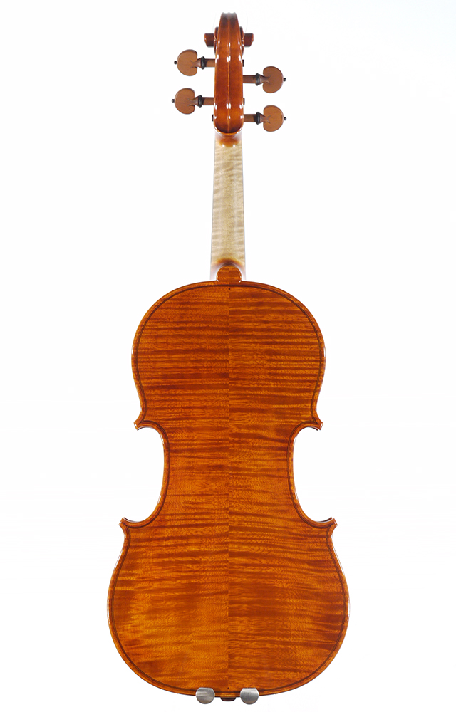 クレモナのバイオリン博物館に展示されているストラディヴァリの名器、クレモネーゼをモデルとした最新作。堂々としたスタイルで、重厚な響きを持っています。もはやクレモナ在住の日本人製作家、というよりクレモナを代表する実力者となった高橋明氏の最新作。試奏はお早目にどうぞ。