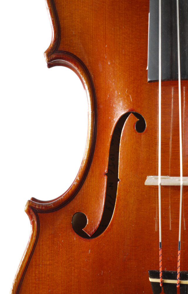 赤褐色を帯びたニスが塗られたガルネリモデルの楽器です。発音が良く響きも感じられ、音色に柔らかさや渋さも持っているフレンチヴァイオリンらしい楽器です。アーチのふくらみがあり、とても弾きやすくパワーもあります。1956年のイレールの円熟期にあたる作品です。