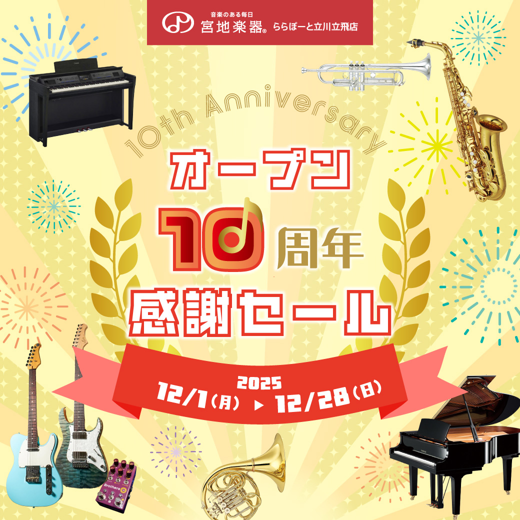 宮地楽器ららぽーと立川立飛店は多摩モノレール立飛駅直結、ららぽーと内にある総合楽器店です。ヤマハピアノなど鍵盤楽器、各種管楽器やギター・エフェクター、弦楽器、楽譜・書籍など幅広く取り揃えています。
