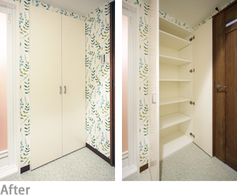 浴室の壁裏にあった無駄な空間を、隣接する廊下収納の奥行に取り込みました。扉は開戸から引戸に交換、棚板を増やして使いやすく。