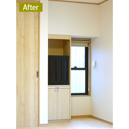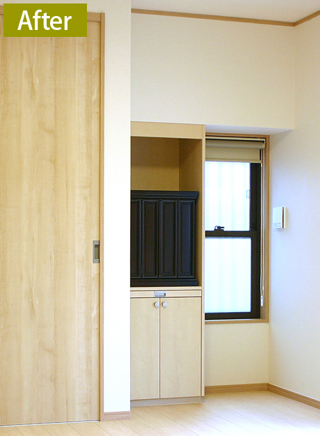 和室を洋室にリフォームされた際に、床の間を仏壇収納に造り替えられました。大き目の仏具なども入れられる開き戸の収納に加え、線香などをしまいやすい引出しも取り付け、使い勝手の良いものにしています。
