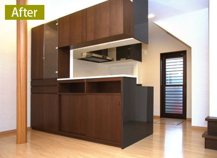 壁付のI型キッチンをA型の対面キッチンにリフォームするのにあわせ、キッチン側とリビング・ダイニング側の両方向から使える収納カウンターを造作しました。新設した下がり壁には釣戸棚を設置、カップボードも組み入れて、多くの食器類が収納できるようにしています。