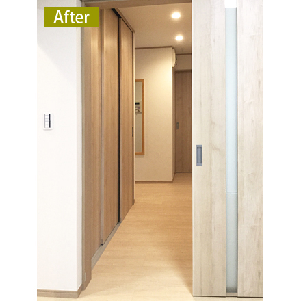 間取りの変更をともなうリフォームをされたのを機に、廊下の壁一面に天井まである大型の収納を新設しました。