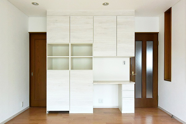 - ワークデスクも兼ねた大型収納に、PC用のコンセントやLANの差込口などを取り付け。ごちゃつきがちな配線まわりもすっきりと。