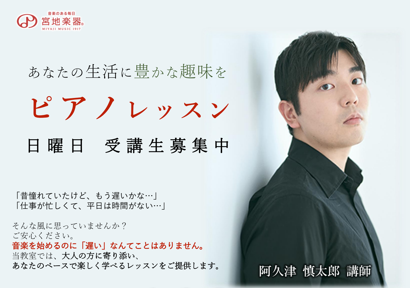 大人気の日曜日ピアノレッスン、新講師をお招きし、増枠いたしました。 まずは体験レッスンからいかがでしょう。こちらから体験日程をお申し込みください。