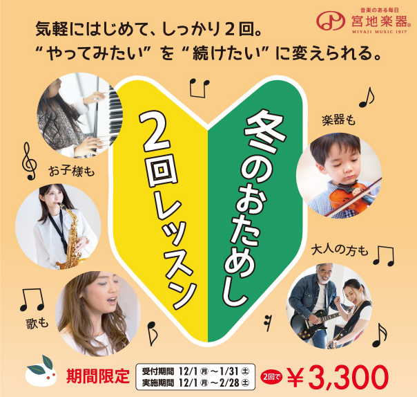 やってみたかった憧れの楽器。おためし2回のレッスンが期間限定3,300円。気に入ったら正規コースで継続! 高幡センターおすすめのコースはこちらから♪※おすすめコース以外も受講可能です 詳しくはお問合せください!