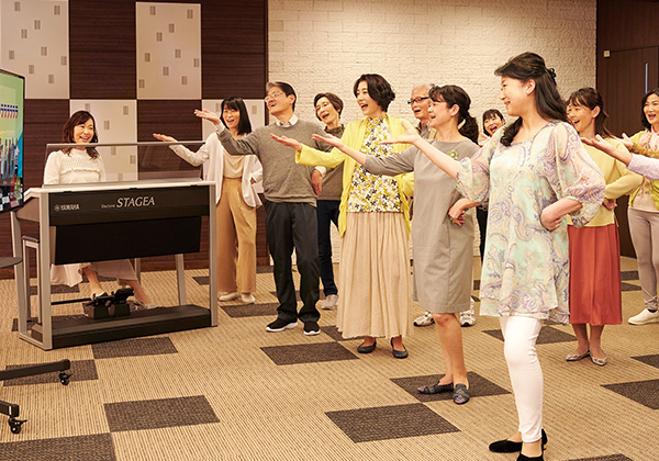 楽譜なしで楽しめるオリジナル映像で簡単なハモリやステップに挑戦♪経験豊富な講師がサポートします。みんな一緒に和気あいあいと楽しみましょう。