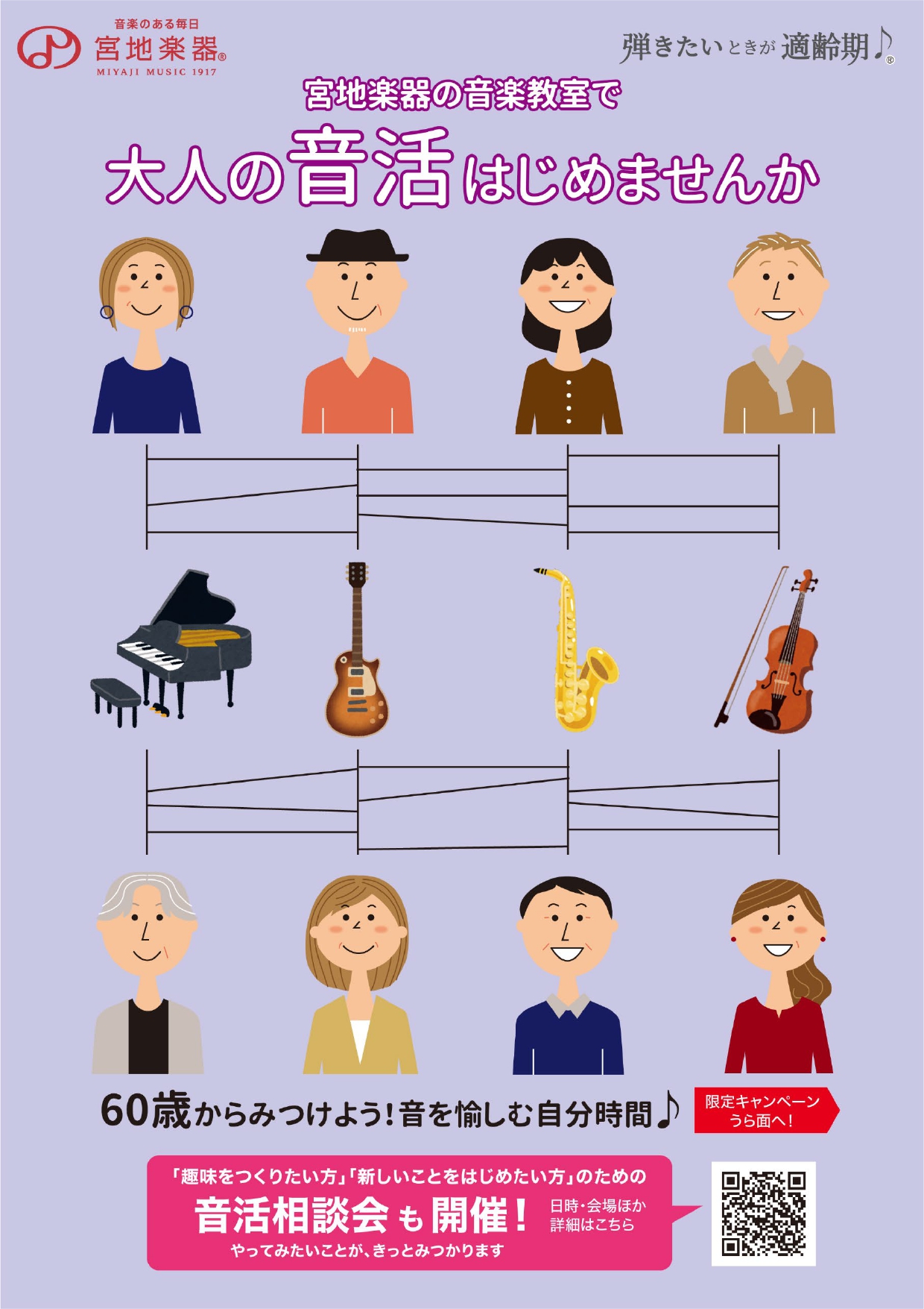 60歳以上の方限定キャンペーン!期間中ワンコイン500円でお好きな3コースまで体験できます。 ”音楽は豊かな心の伴奏者” いつまでも健康な身体と心を目指して先ずはお試しを!! ウェルネス系もお問い合わせ下さい♪