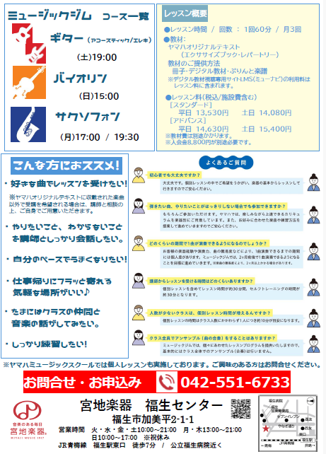 福生センターミュージックジムレッスン開講枠(体験レッスンは個人レッスンで行います)