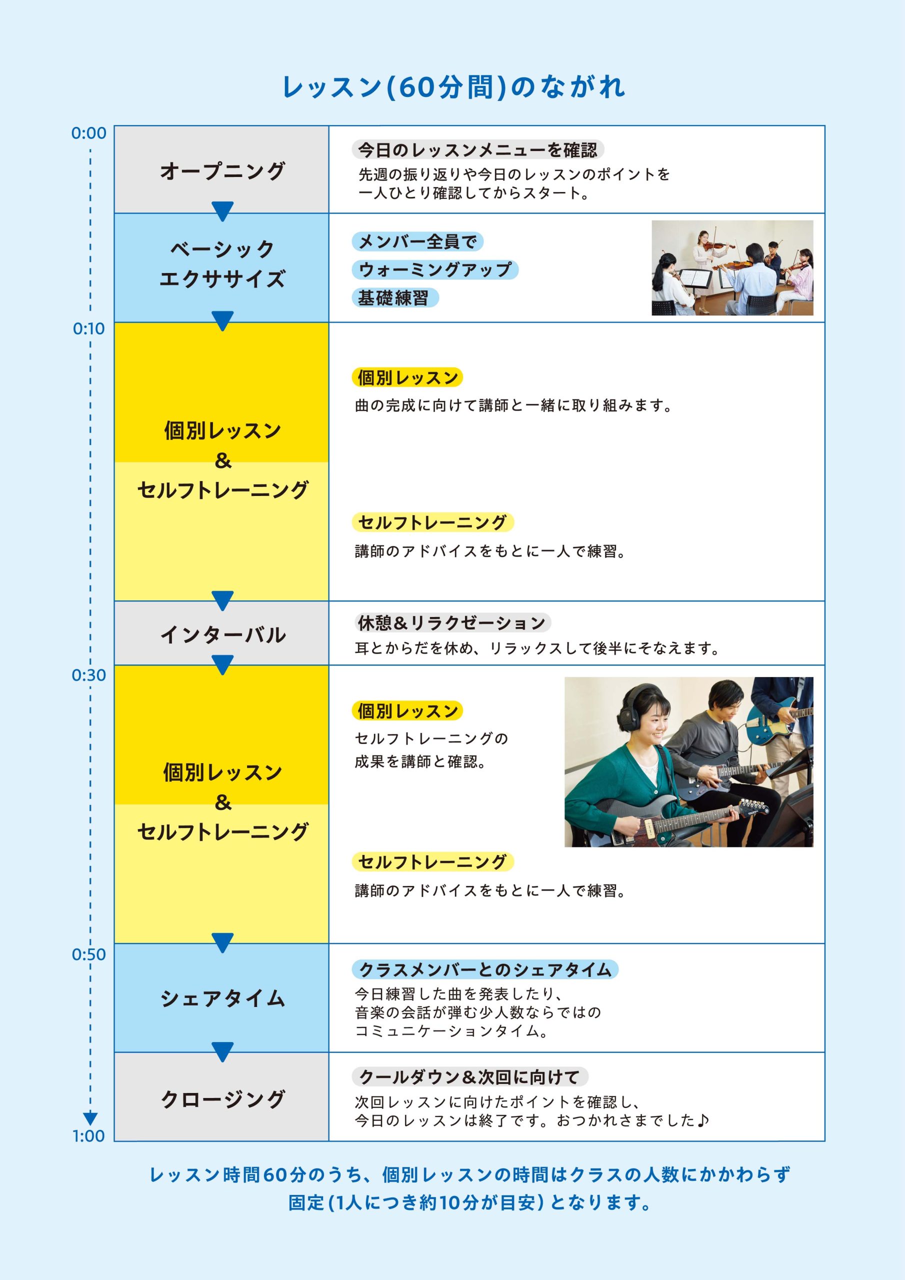 そして個人レッスン同様自分の好きな曲を選択することができる為すでにやりたいことや目標がある方、能動的に音楽を楽しみたい方にオススメです。