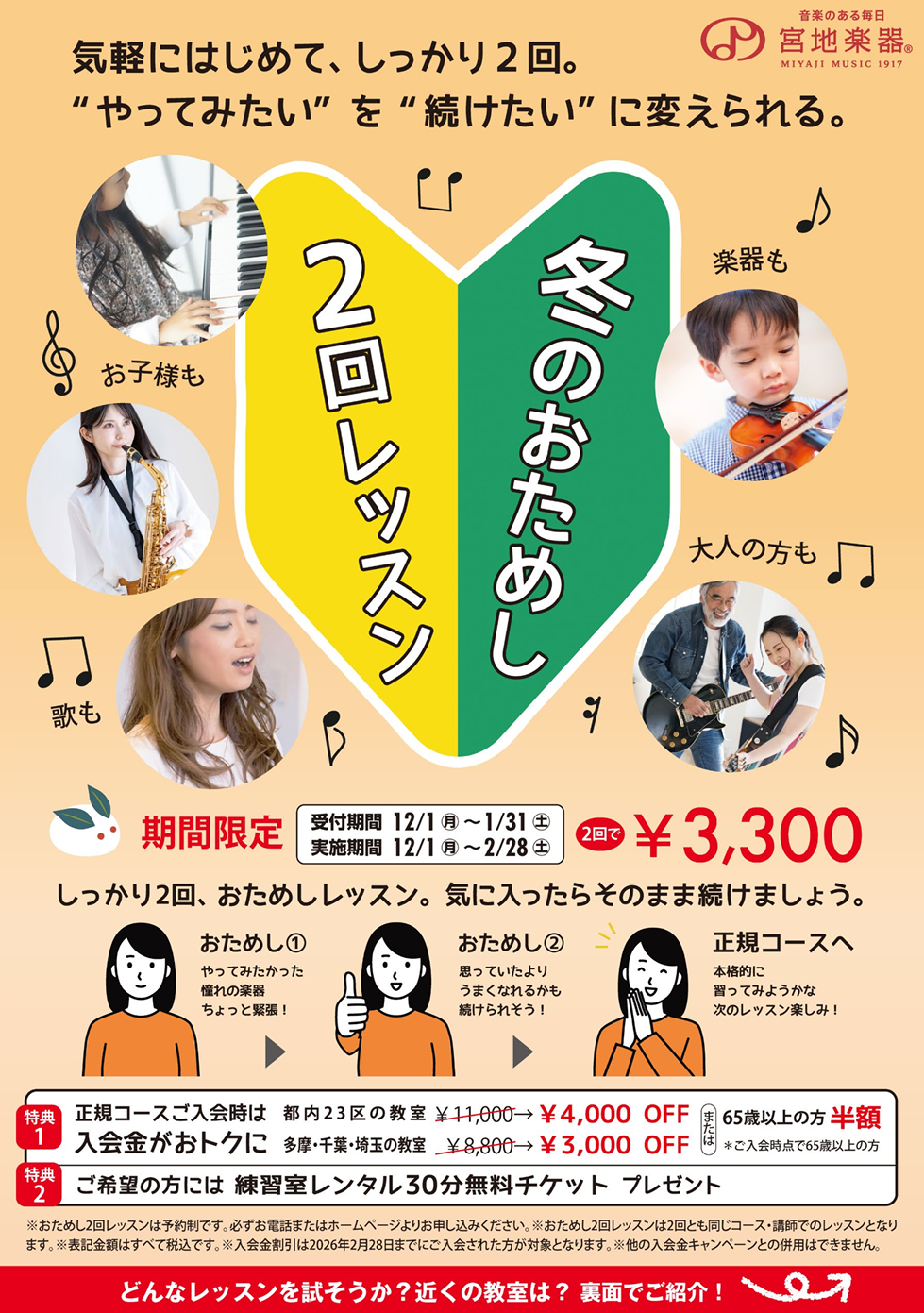 この冬まずは気軽に2回レッスンをして、音楽との距離をグッと縮めてみてくださいませ*´꒳`*)ノ⁾⁾