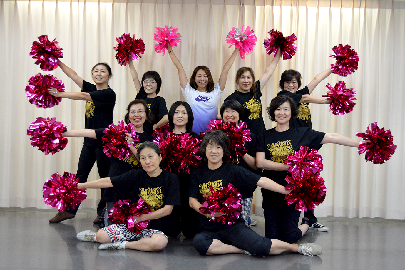 レッスンはゆっくりストレッチからスタート。ポンポンを持てば自然に笑顔に!3~4カ月程度で1つのナンバー(作品)を仕上げるペースでレッスンしています。