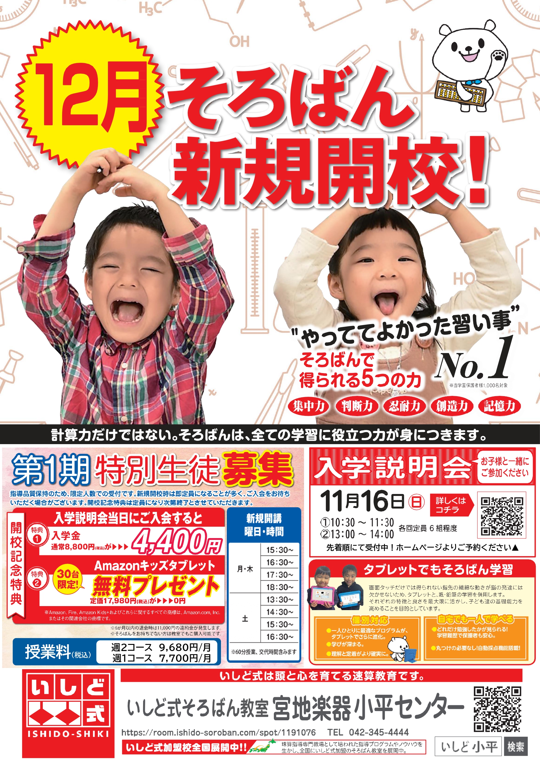 宮地楽器小平センターにそろばん教室が新しく開講します!!