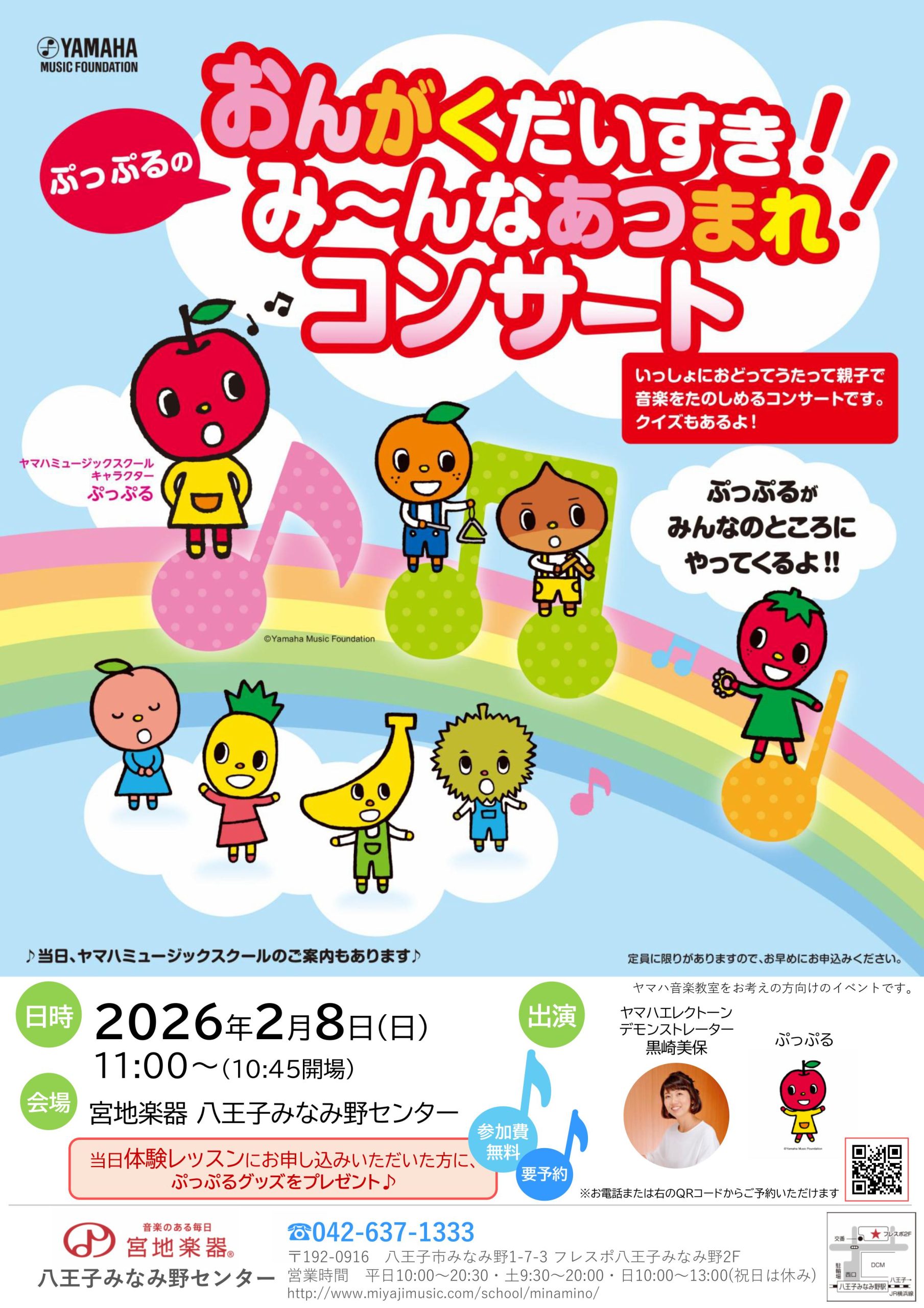2/8(日) ヤマハ『おんがくだいすき!ぷっぷるのみ~んなあつまれ!コンサート』実施します♪