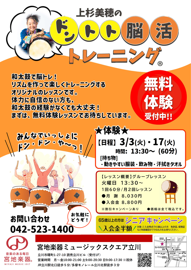 宮地楽器ミュージックスクエア立川では、和太鼓で楽しく脳トレレッスン「ドントト脳活トレーニング」コースが開講中です!