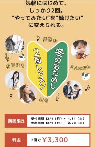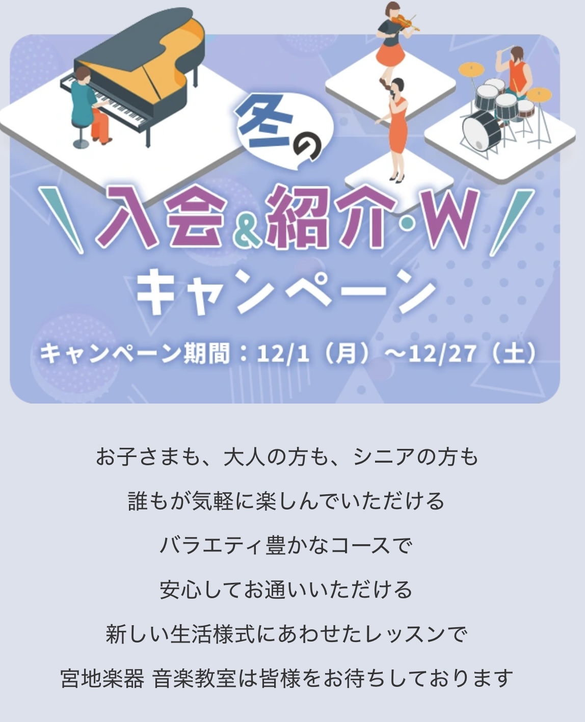 宮地楽器では『冬の入会キャンペーン』『冬のおためし2回レッスン』の実施中です