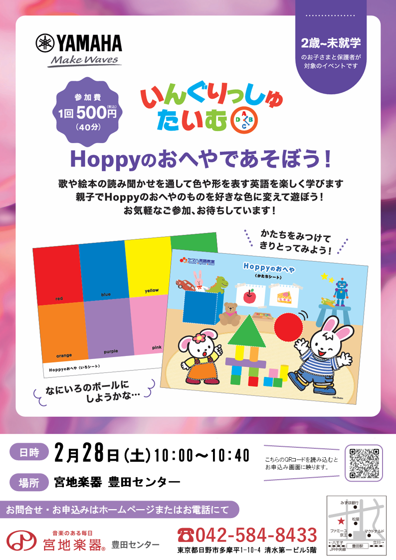 歌や絵本で色や形を表す英語を楽しく学びます。親子でHoppyのおへやのものを好きな色に変えて遊ぼう!